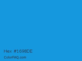 Hex #1698de Color is a normal blue color and the nearest color is Curious Blue #2596d1. Hex code #1698de and RGB value is rgb(22,152,222). In RGB color space, this color is composed of 9% red, 60% green, 87% blue, In CMYK color space, this color is composed of 90% cyan, 32% magenta, 0% yellow , 13% black , In HSL color space, this color has a hue angle of 201° , 82% saturation and 48% lightness.