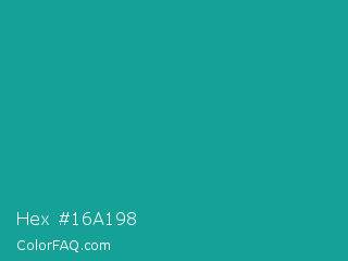 Hex #16a198 Color is a normal cyan color and the nearest color is Niagara #06a189. Hex code #16a198 and RGB value is rgb(22,161,152). In RGB color space, this color is composed of 9% red, 63% green, 60% blue, In CMYK color space, this color is composed of 86% cyan, 0% magenta, 6% yellow , 37% black , In HSL color space, this color has a hue angle of 176° , 76% saturation and 36% lightness.