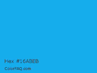 Hex #16abeb Color is a normal blue color and the nearest color is Button Blue #24a0ed. Hex code #16abeb and RGB value is rgb(22,171,235). In RGB color space, this color is composed of 9% red, 67% green, 92% blue, In CMYK color space, this color is composed of 91% cyan, 27% magenta, 0% yellow , 8% black , In HSL color space, this color has a hue angle of 198° , 84% saturation and 50% lightness.