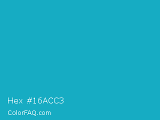 Hex #16acc3 Color is a normal cyan color and the nearest color is Pacific Blue #1ca9c9. Hex code #16acc3 and RGB value is rgb(22,172,195). In RGB color space, this color is composed of 9% red, 67% green, 76% blue, In CMYK color space, this color is composed of 89% cyan, 12% magenta, 0% yellow , 24% black , In HSL color space, this color has a hue angle of 188° , 80% saturation and 43% lightness.