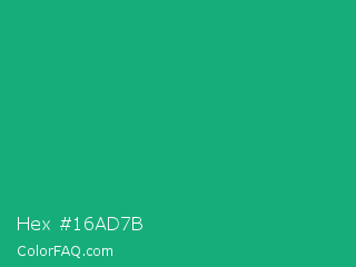 Hex #16ad7b Color is a normal green color and the nearest color is Green Crayola #1cac78. Hex code #16ad7b and RGB value is rgb(22,173,123). In RGB color space, this color is composed of 9% red, 68% green, 48% blue, In CMYK color space, this color is composed of 87% cyan, 0% magenta, 29% yellow , 32% black , In HSL color space, this color has a hue angle of 160° , 77% saturation and 38% lightness.