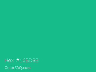 Hex #16bd8b Color is a normal green color and the nearest color is Mountain Meadow Crayola #1ab385. Hex code #16bd8b and RGB value is rgb(22,189,139). In RGB color space, this color is composed of 9% red, 74% green, 55% blue, In CMYK color space, this color is composed of 88% cyan, 0% magenta, 26% yellow , 26% black , In HSL color space, this color has a hue angle of 162° , 79% saturation and 41% lightness.