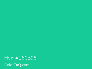 Hex #16cb98 Color is a normal green color and the nearest color is Caribbean Green #00cc99. Hex code #16cb98 and RGB value is rgb(22,203,152). In RGB color space, this color is composed of 9% red, 80% green, 60% blue, In CMYK color space, this color is composed of 89% cyan, 0% magenta, 25% yellow , 20% black , In HSL color space, this color has a hue angle of 163° , 80% saturation and 44% lightness.