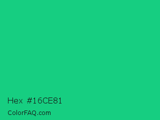 Hex #16ce81 Color is a normal green color and the nearest color is Mountain Meadow Crayola #1ab385. Hex code #16ce81 and RGB value is rgb(22,206,129). In RGB color space, this color is composed of 9% red, 81% green, 51% blue, In CMYK color space, this color is composed of 89% cyan, 0% magenta, 37% yellow , 19% black , In HSL color space, this color has a hue angle of 155° , 81% saturation and 45% lightness.