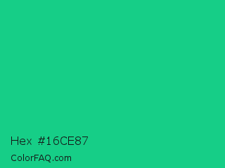 Hex #16ce87 Color is a normal green color and the nearest color is Mountain Meadow Crayola #1ab385. Hex code #16ce87 and RGB value is rgb(22,206,135). In RGB color space, this color is composed of 9% red, 81% green, 53% blue, In CMYK color space, this color is composed of 89% cyan, 0% magenta, 34% yellow , 19% black , In HSL color space, this color has a hue angle of 157° , 81% saturation and 45% lightness.