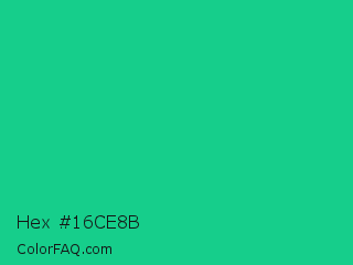 Hex #16ce8b Color is a normal green color and the nearest color is Caribbean Green #00cc99. Hex code #16ce8b and RGB value is rgb(22,206,139). In RGB color space, this color is composed of 9% red, 81% green, 55% blue, In CMYK color space, this color is composed of 89% cyan, 0% magenta, 33% yellow , 19% black , In HSL color space, this color has a hue angle of 158° , 81% saturation and 45% lightness.