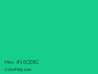 Hex #16ce8c Color is a normal green color and the nearest color is Caribbean Green #00cc99. Hex code #16ce8c and RGB value is rgb(22,206,140). In RGB color space, this color is composed of 9% red, 81% green, 55% blue, In CMYK color space, this color is composed of 89% cyan, 0% magenta, 32% yellow , 19% black , In HSL color space, this color has a hue angle of 158° , 81% saturation and 45% lightness.