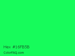 Hex #16fb5b Color is a normal green color and the nearest color is Malachite #0bda51. Hex code #16fb5b and RGB value is rgb(22,251,91). In RGB color space, this color is composed of 9% red, 98% green, 36% blue, In CMYK color space, this color is composed of 91% cyan, 0% magenta, 64% yellow , 2% black , In HSL color space, this color has a hue angle of 138° , 97% saturation and 54% lightness.