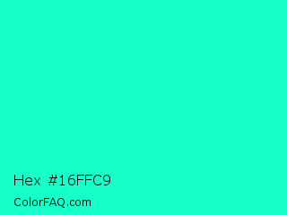 Hex #16ffc9 Color is a normal cyan color and the nearest color is Bright Turquoise #08e8de. Hex code #16ffc9 and RGB value is rgb(22,255,201). In RGB color space, this color is composed of 9% red, 100% green, 79% blue, In CMYK color space, this color is composed of 91% cyan, 0% magenta, 21% yellow , 0% black , In HSL color space, this color has a hue angle of 166° , 100% saturation and 54% lightness.