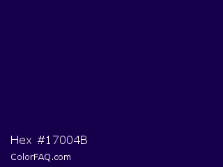 Hex #17004b Color is a very dark indigo color and the nearest color is Tolopea #1b0245. Hex code #17004b and RGB value is rgb(23,0,75). In RGB color space, this color is composed of 9% red, 0% green, 29% blue, In CMYK color space, this color is composed of 69% cyan, 100% magenta, 0% yellow , 71% black , In HSL color space, this color has a hue angle of 258° , 100% saturation and 15% lightness.