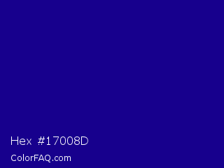 Hex #17008d Color is a dark indigo color and the nearest color is Ultramarine #120a8f. Hex code #17008d and RGB value is rgb(23,0,141). In RGB color space, this color is composed of 9% red, 0% green, 55% blue, In CMYK color space, this color is composed of 84% cyan, 100% magenta, 0% yellow , 45% black , In HSL color space, this color has a hue angle of 250° , 100% saturation and 28% lightness.