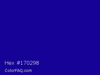 Hex #170298 Color is a dark indigo color and the nearest color is Ultramarine #120a8f. Hex code #170298 and RGB value is rgb(23,2,152). In RGB color space, this color is composed of 9% red, 1% green, 60% blue, In CMYK color space, this color is composed of 85% cyan, 99% magenta, 0% yellow , 40% black , In HSL color space, this color has a hue angle of 248° , 97% saturation and 30% lightness.