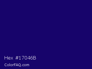 Hex #17046b Color is a very dark indigo color and the nearest color is Arapawa #110c6c. Hex code #17046b and RGB value is rgb(23,4,107). In RGB color space, this color is composed of 9% red, 2% green, 42% blue, In CMYK color space, this color is composed of 79% cyan, 96% magenta, 0% yellow , 58% black , In HSL color space, this color has a hue angle of 251° , 93% saturation and 22% lightness.