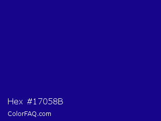 Hex #17058b Color is a dark indigo color and the nearest color is Ultramarine #120a8f. Hex code #17058b and RGB value is rgb(23,5,139). In RGB color space, this color is composed of 9% red, 2% green, 55% blue, In CMYK color space, this color is composed of 83% cyan, 96% magenta, 0% yellow , 45% black , In HSL color space, this color has a hue angle of 248° , 93% saturation and 28% lightness.