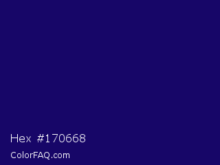 Hex #170668 Color is a very dark indigo color and the nearest color is Arapawa #110c6c. Hex code #170668 and RGB value is rgb(23,6,104). In RGB color space, this color is composed of 9% red, 2% green, 41% blue, In CMYK color space, this color is composed of 78% cyan, 94% magenta, 0% yellow , 59% black , In HSL color space, this color has a hue angle of 250° , 89% saturation and 22% lightness.