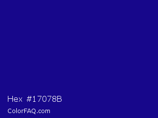Hex #17078b Color is a dark indigo color and the nearest color is Ultramarine #120a8f. Hex code #17078b and RGB value is rgb(23,7,139). In RGB color space, this color is composed of 9% red, 3% green, 55% blue, In CMYK color space, this color is composed of 83% cyan, 95% magenta, 0% yellow , 45% black , In HSL color space, this color has a hue angle of 247° , 90% saturation and 29% lightness.