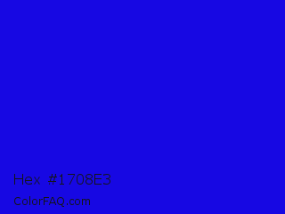 Hex #1708e3 Color is a normal indigo color and the nearest color is Bluebonnet #1c1cf0. Hex code #1708e3 and RGB value is rgb(23,8,227). In RGB color space, this color is composed of 9% red, 3% green, 89% blue, In CMYK color space, this color is composed of 90% cyan, 96% magenta, 0% yellow , 11% black , In HSL color space, this color has a hue angle of 244° , 93% saturation and 46% lightness.