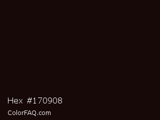 Hex #170908 Color is a almost black red color and the nearest color is Asphalt #130a06. Hex code #170908 and RGB value is rgb(23,9,8). In RGB color space, this color is composed of 9% red, 4% green, 3% blue, In CMYK color space, this color is composed of 0% cyan, 61% magenta, 65% yellow , 91% black , In HSL color space, this color has a hue angle of 4° , 48% saturation and 6% lightness.