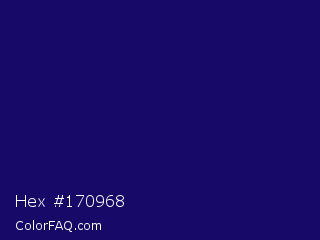 Hex #170968 Color is a very dark indigo color and the nearest color is Arapawa #110c6c. Hex code #170968 and RGB value is rgb(23,9,104). In RGB color space, this color is composed of 9% red, 4% green, 41% blue, In CMYK color space, this color is composed of 78% cyan, 91% magenta, 0% yellow , 59% black , In HSL color space, this color has a hue angle of 249° , 84% saturation and 22% lightness.