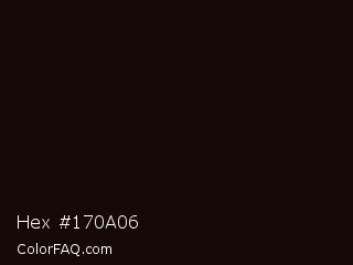 Hex #170a06 Color is a almost black red color and the nearest color is Asphalt #130a06. Hex code #170a06 and RGB value is rgb(23,10,6). In RGB color space, this color is composed of 9% red, 4% green, 2% blue, In CMYK color space, this color is composed of 0% cyan, 57% magenta, 74% yellow , 91% black , In HSL color space, this color has a hue angle of 14° , 59% saturation and 6% lightness.