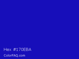 Hex #170eba Color is a normal indigo color and the nearest color is Zaffre #0014a8. Hex code #170eba and RGB value is rgb(23,14,186). In RGB color space, this color is composed of 9% red, 5% green, 73% blue, In CMYK color space, this color is composed of 88% cyan, 92% magenta, 0% yellow , 27% black , In HSL color space, this color has a hue angle of 243° , 86% saturation and 39% lightness.