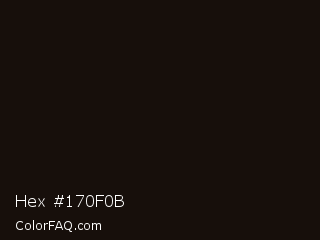 Hex #170f0b Color is a almost black orange color and the nearest color is Licorice #1a1110. Hex code #170f0b and RGB value is rgb(23,15,11). In RGB color space, this color is composed of 9% red, 6% green, 4% blue, In CMYK color space, this color is composed of 0% cyan, 35% magenta, 52% yellow , 91% black , In HSL color space, this color has a hue angle of 20° , 35% saturation and 7% lightness.