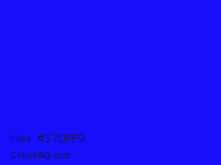 Hex #170ff9 Color is a normal indigo color and the nearest color is Bluebonnet #1c1cf0. Hex code #170ff9 and RGB value is rgb(23,15,249). In RGB color space, this color is composed of 9% red, 6% green, 98% blue, In CMYK color space, this color is composed of 91% cyan, 94% magenta, 0% yellow , 2% black , In HSL color space, this color has a hue angle of 242° , 95% saturation and 52% lightness.