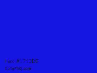 Hex #1713de Color is a normal indigo color and the nearest color is Bluebonnet #1c1cf0. Hex code #1713de and RGB value is rgb(23,19,222). In RGB color space, this color is composed of 9% red, 7% green, 87% blue, In CMYK color space, this color is composed of 90% cyan, 91% magenta, 0% yellow , 13% black , In HSL color space, this color has a hue angle of 241° , 84% saturation and 47% lightness.
