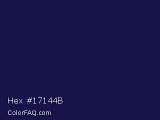 Hex #17144b Color is a very dark indigo color and the nearest color is Bunting #151f4c. Hex code #17144b and RGB value is rgb(23,20,75). In RGB color space, this color is composed of 9% red, 8% green, 29% blue, In CMYK color space, this color is composed of 69% cyan, 73% magenta, 0% yellow , 71% black , In HSL color space, this color has a hue angle of 243° , 58% saturation and 19% lightness.