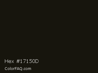 Hex #17150d Color is a almost black yellow color and the nearest color is Licorice #1a1110. Hex code #17150d and RGB value is rgb(23,21,13). In RGB color space, this color is composed of 9% red, 8% green, 5% blue, In CMYK color space, this color is composed of 0% cyan, 9% magenta, 43% yellow , 91% black , In HSL color space, this color has a hue angle of 48° , 28% saturation and 7% lightness.