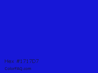 Hex #1717d7 Color is a normal blue color and the nearest color is Bluebonnet #1c1cf0. Hex code #1717d7 and RGB value is rgb(23,23,215). In RGB color space, this color is composed of 9% red, 9% green, 84% blue, In CMYK color space, this color is composed of 89% cyan, 89% magenta, 0% yellow , 16% black , In HSL color space, this color has a hue angle of 240° , 81% saturation and 47% lightness.