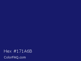 Hex #171a6b Color is a dark blue color and the nearest color is Lucky Point #1a1a68. Hex code #171a6b and RGB value is rgb(23,26,107). In RGB color space, this color is composed of 9% red, 10% green, 42% blue, In CMYK color space, this color is composed of 79% cyan, 76% magenta, 0% yellow , 58% black , In HSL color space, this color has a hue angle of 238° , 65% saturation and 25% lightness.