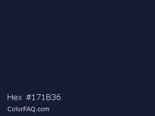 Hex #171b36 Color is a very dark blue color and the nearest color is Haiti #1b1035. Hex code #171b36 and RGB value is rgb(23,27,54). In RGB color space, this color is composed of 9% red, 11% green, 21% blue, In CMYK color space, this color is composed of 57% cyan, 50% magenta, 0% yellow , 79% black , In HSL color space, this color has a hue angle of 232° , 40% saturation and 15% lightness.