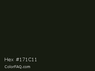 Hex #171c11 Color is a almost black green color and the nearest color is Hunter Green #161d10. Hex code #171c11 and RGB value is rgb(23,28,17). In RGB color space, this color is composed of 9% red, 11% green, 7% blue, In CMYK color space, this color is composed of 18% cyan, 0% magenta, 39% yellow , 89% black , In HSL color space, this color has a hue angle of 87° , 24% saturation and 9% lightness.