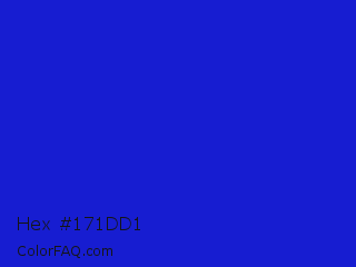 Hex #171dd1 Color is a normal blue color and the nearest color is Bluebonnet #1c1cf0. Hex code #171dd1 and RGB value is rgb(23,29,209). In RGB color space, this color is composed of 9% red, 11% green, 82% blue, In CMYK color space, this color is composed of 89% cyan, 86% magenta, 0% yellow , 18% black , In HSL color space, this color has a hue angle of 238° , 80% saturation and 45% lightness.