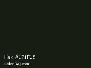 Hex #171f15 Color is a very dark green color and the nearest color is Hunter Green #161d10. Hex code #171f15 and RGB value is rgb(23,31,21). In RGB color space, this color is composed of 9% red, 12% green, 8% blue, In CMYK color space, this color is composed of 26% cyan, 0% magenta, 32% yellow , 88% black , In HSL color space, this color has a hue angle of 108° , 19% saturation and 10% lightness.