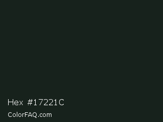 Hex #17221c Color is a very dark green color and the nearest color is Dark Jungle Green #1a2421. Hex code #17221c and RGB value is rgb(23,34,28). In RGB color space, this color is composed of 9% red, 13% green, 11% blue, In CMYK color space, this color is composed of 32% cyan, 0% magenta, 18% yellow , 87% black , In HSL color space, this color has a hue angle of 147° , 19% saturation and 11% lightness.