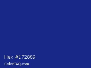 Hex #172889 Color is a normal blue color and the nearest color is Jacksons Purple #20208d. Hex code #172889 and RGB value is rgb(23,40,137). In RGB color space, this color is composed of 9% red, 16% green, 54% blue, In CMYK color space, this color is composed of 83% cyan, 71% magenta, 0% yellow , 46% black , In HSL color space, this color has a hue angle of 231° , 71% saturation and 31% lightness.