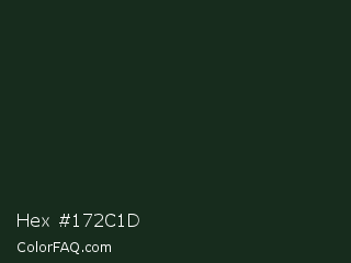 Hex #172c1d Color is a very dark green color and the nearest color is Celtic #163222. Hex code #172c1d and RGB value is rgb(23,44,29). In RGB color space, this color is composed of 9% red, 17% green, 11% blue, In CMYK color space, this color is composed of 48% cyan, 0% magenta, 34% yellow , 83% black , In HSL color space, this color has a hue angle of 137° , 31% saturation and 13% lightness.