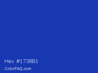 Hex #1738b1 Color is a normal blue color and the nearest color is Persian Blue #1c39bb. Hex code #1738b1 and RGB value is rgb(23,56,177). In RGB color space, this color is composed of 9% red, 22% green, 69% blue, In CMYK color space, this color is composed of 87% cyan, 68% magenta, 0% yellow , 31% black , In HSL color space, this color has a hue angle of 227° , 77% saturation and 39% lightness.