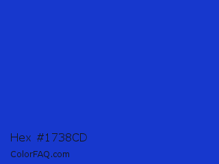 Hex #1738cd Color is a normal blue color and the nearest color is Persian Blue #1c39bb. Hex code #1738cd and RGB value is rgb(23,56,205). In RGB color space, this color is composed of 9% red, 22% green, 80% blue, In CMYK color space, this color is composed of 89% cyan, 73% magenta, 0% yellow , 20% black , In HSL color space, this color has a hue angle of 229° , 80% saturation and 45% lightness.
