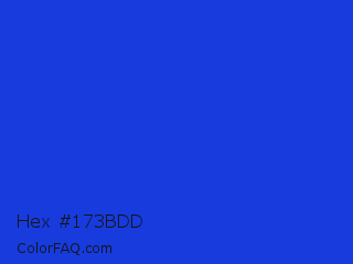 Hex #173bdd Color is a normal blue color and the nearest color is Palatinate Blue #273be2. Hex code #173bdd and RGB value is rgb(23,59,221). In RGB color space, this color is composed of 9% red, 23% green, 87% blue, In CMYK color space, this color is composed of 90% cyan, 73% magenta, 0% yellow , 13% black , In HSL color space, this color has a hue angle of 229° , 81% saturation and 48% lightness.