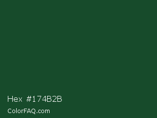 Hex #174b2b Color is a very dark green color and the nearest color is Cal Poly Pomona Green #1e4d2b. Hex code #174b2b and RGB value is rgb(23,75,43). In RGB color space, this color is composed of 9% red, 29% green, 17% blue, In CMYK color space, this color is composed of 69% cyan, 0% magenta, 43% yellow , 71% black , In HSL color space, this color has a hue angle of 143° , 53% saturation and 19% lightness.