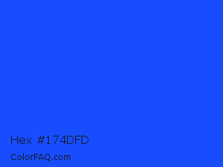 Hex #174dfd Color is a normal blue color and the nearest color is Blue RYB #0247fe. Hex code #174dfd and RGB value is rgb(23,77,253). In RGB color space, this color is composed of 9% red, 30% green, 99% blue, In CMYK color space, this color is composed of 91% cyan, 70% magenta, 0% yellow , 1% black , In HSL color space, this color has a hue angle of 226° , 98% saturation and 54% lightness.