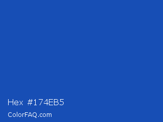 Hex #174eb5 Color is a normal blue color and the nearest color is Sapphire #0f52ba. Hex code #174eb5 and RGB value is rgb(23,78,181). In RGB color space, this color is composed of 9% red, 31% green, 71% blue, In CMYK color space, this color is composed of 87% cyan, 57% magenta, 0% yellow , 29% black , In HSL color space, this color has a hue angle of 219° , 77% saturation and 40% lightness.