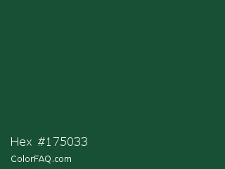 Hex #175033 Color is a very dark green color and the nearest color is Cal Poly Pomona Green #1e4d2b. Hex code #175033 and RGB value is rgb(23,80,51). In RGB color space, this color is composed of 9% red, 31% green, 20% blue, In CMYK color space, this color is composed of 71% cyan, 0% magenta, 36% yellow , 69% black , In HSL color space, this color has a hue angle of 149° , 55% saturation and 20% lightness.