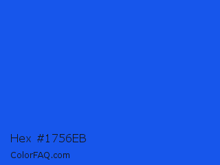 Hex #1756eb Color is a normal blue color and the nearest color is Blue RYB #0247fe. Hex code #1756eb and RGB value is rgb(23,86,235). In RGB color space, this color is composed of 9% red, 34% green, 92% blue, In CMYK color space, this color is composed of 90% cyan, 63% magenta, 0% yellow , 8% black , In HSL color space, this color has a hue angle of 222° , 84% saturation and 51% lightness.