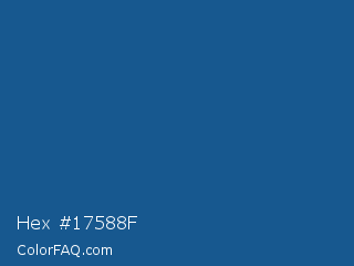 Hex #17588f Color is a normal blue color and the nearest color is Yale Blue #0f4d92. Hex code #17588f and RGB value is rgb(23,88,143). In RGB color space, this color is composed of 9% red, 35% green, 56% blue, In CMYK color space, this color is composed of 84% cyan, 38% magenta, 0% yellow , 44% black , In HSL color space, this color has a hue angle of 208° , 72% saturation and 33% lightness.