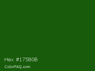 Hex #175b0b Color is a very dark green color and the nearest color is Lincoln Green #195905. Hex code #175b0b and RGB value is rgb(23,91,11). In RGB color space, this color is composed of 9% red, 36% green, 4% blue, In CMYK color space, this color is composed of 75% cyan, 0% magenta, 88% yellow , 64% black , In HSL color space, this color has a hue angle of 111° , 78% saturation and 20% lightness.