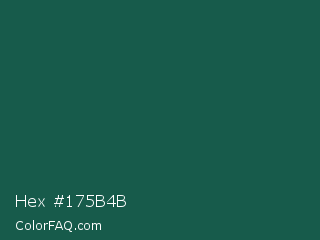 Hex #175b4b Color is a very dark cyan color and the nearest color is Eden #105852. Hex code #175b4b and RGB value is rgb(23,91,75). In RGB color space, this color is composed of 9% red, 36% green, 29% blue, In CMYK color space, this color is composed of 75% cyan, 0% magenta, 18% yellow , 64% black , In HSL color space, this color has a hue angle of 166° , 60% saturation and 22% lightness.